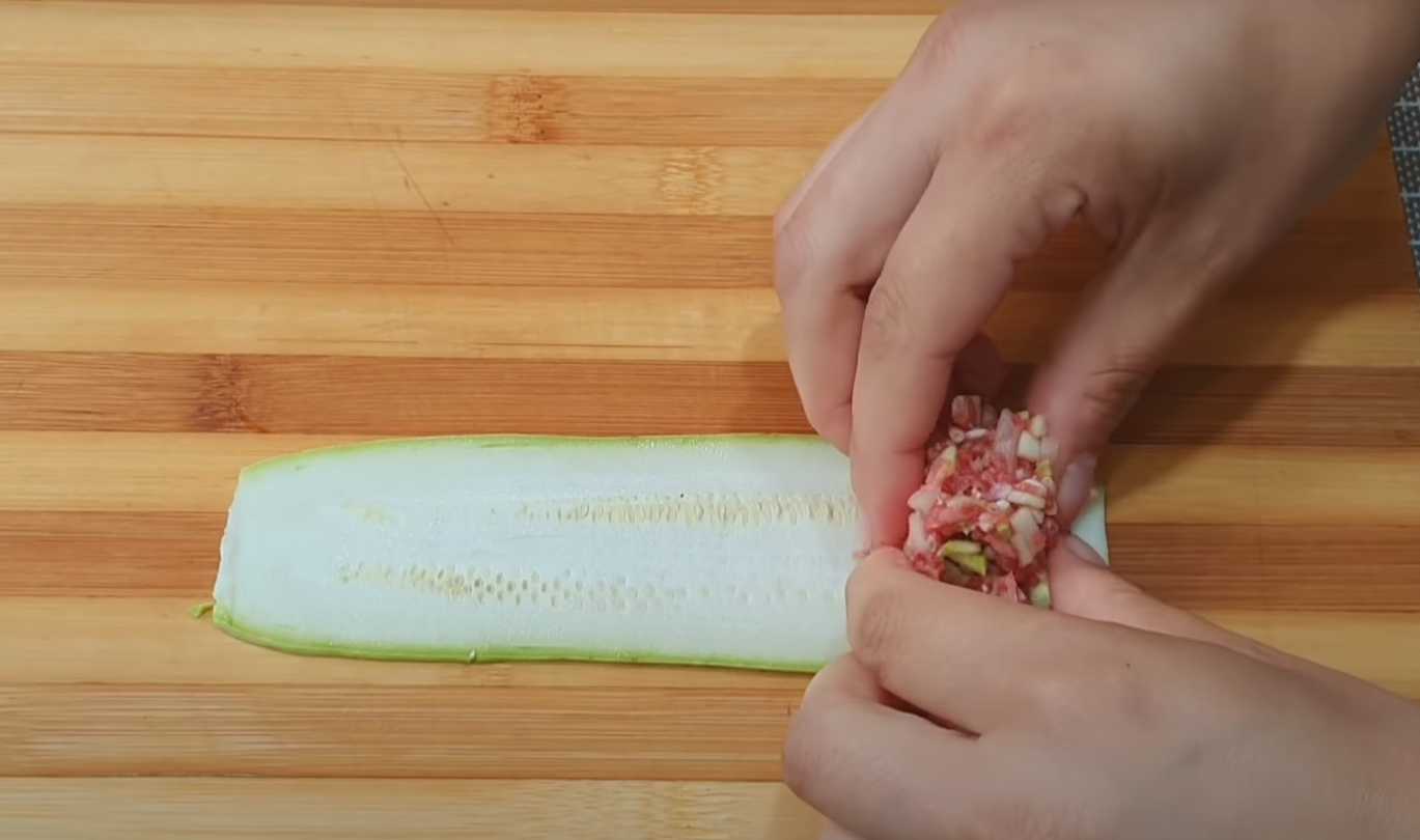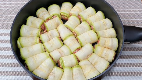 Zapomnij o gołąbkach – to jest o wiele smaczniejsze: Pomysłowe wałeczki z cukinii: Mięso mielone zawijam w cukinię i wkładam na patelnię.