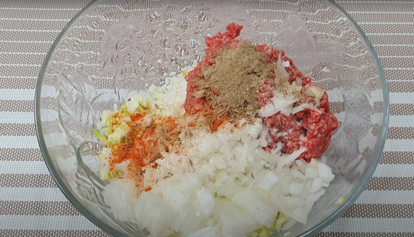 Cukinię pokrój w cienkie plasterki, przełóż do miski, posól i odstaw. Nie odpowiednio pokrojone kawałki cukinii dodaj do nadzienia. Do miski wrzuć posiekaną cukinię razem z ryżem, mielonym mięsem, drobno posiekaną cebulą, solą oraz pieprzem i wymieszaj.