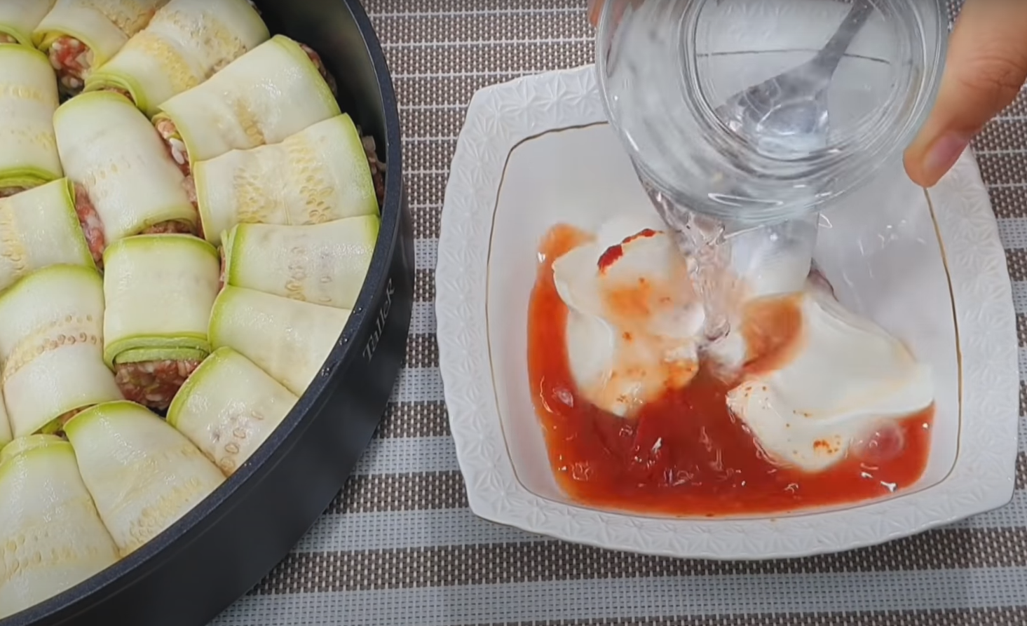 Gdy masz już gotowe wszystkie roladki z cukinii, przygotuj sos. W osobnej misce wymieszaj koncentrat pomidorowy, śmietanę i wodę.