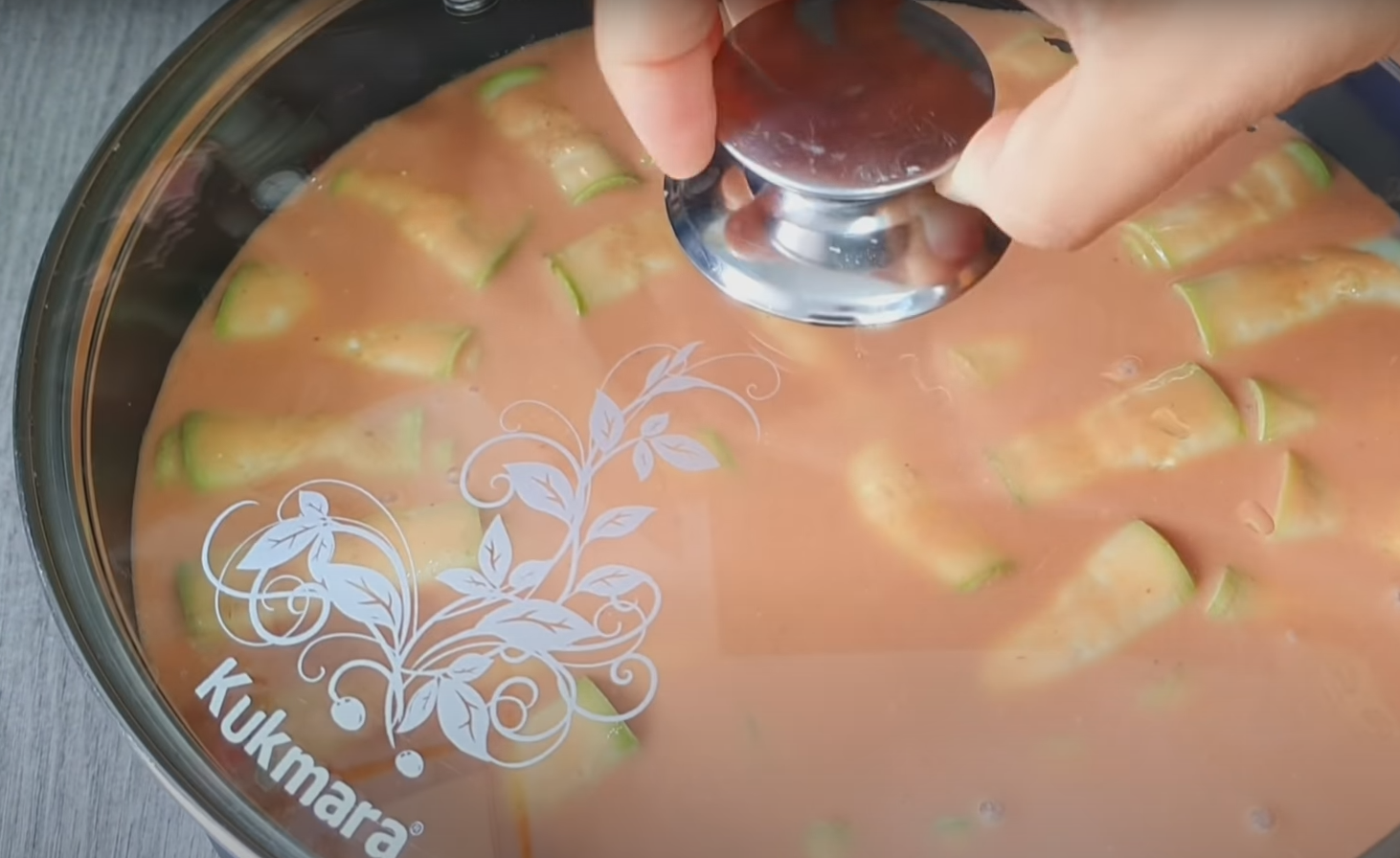 Roladki z cukinii polej sosem, przykryj pokrywką i gotuj przez 40 minut na małym ogniu.
