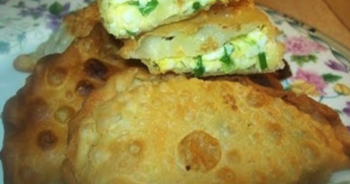 Teraz weź ciasto, uformuj je w rolkę, a następnie pokrój na 10-12 części. Weź jeden kawałek ciasta i bardzo cienko rozwałkuj. Umieść nadzienie jajeczne na połowie ciasta, przykryj drugą połową ciasta i dobrze ściśnij krawędzie ( masz otrzymać przekąskę na kształt tradycyjnych pierogów). W ten sposób uformuj pozostałe składniki.