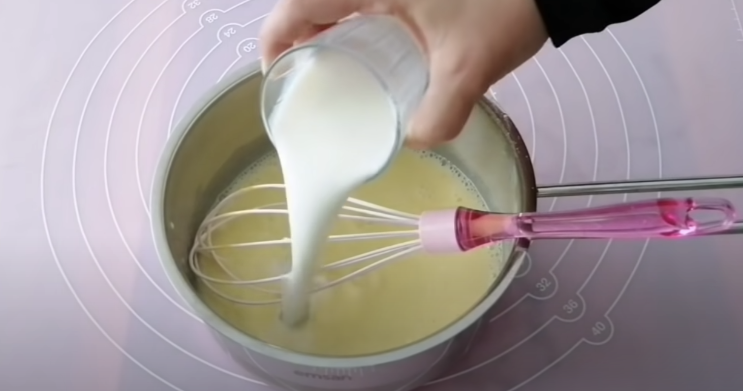 W celu przygotowania kremu należy w odrobinie mleka wymieszać skrobię, jajka oraz cukier. Potem dodać resztę mleka i całość dokładnie wymieszać.