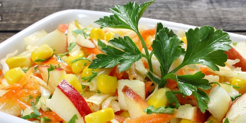 Obierz jabłko, a następnie je zetrzyj lub pokrój. Posiekaj kapustę i pokrój marchewkę. Wymieszaj je z kukurydzą oraz jabłkiem. Dodaj sok z cytryny oraz dopraw solą i pieprzem.