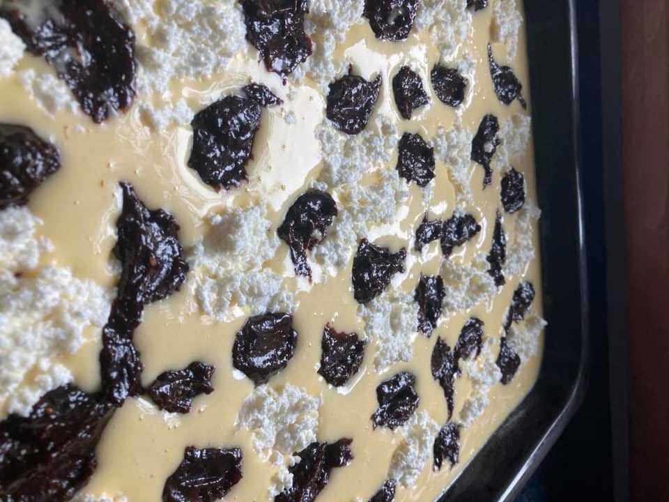 Do nadzienia dodajemy dżem w formie grudek, po czym zalewamy wszystko resztą ciasta.