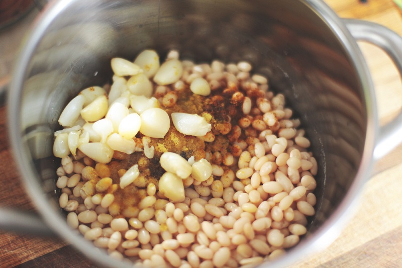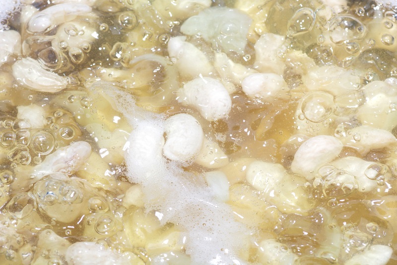 Na początek musisz moczyć fasolę w wodzie przez całą noc, a przy najmniej przez 8 godzin, po czym wodę musisz wylać, a ziarna dokładnie opłukać. Zalej ponownie zimną wodą i podgrzej na średnim ogniu. Gdy tylko woda się zagotuje, odlej ją, opłucz fasolę zimną wodą na durszlaku.