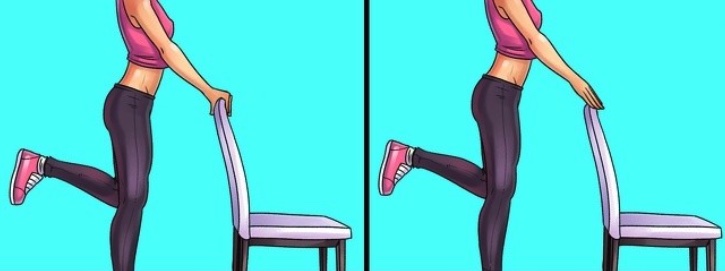Stań za krzesłem i chwyć się go obiema rękami. Zegnij jedną nogę w kolanie i unieś pod kątem prostym. Delikatnie podnieś kostkę drugiej nogi do momentu aż ciężar zostanie całkowicie przeniesiony na palce. Razem z kostką unieś także dłonie tak, aby palce były możliwie jak najbardziej wyprostowane.