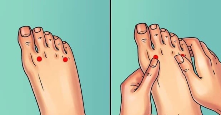 Jeśli po długim i męczącym dniu bolą Cię stopy połóż oba palce na punktach, które przedstawione są na obrazku (między palcami 1 i 2, 4 i 5) i delikatnie je masuj przez około 10-15 minut. Pomoże Ci to rozluźnić spięty odcinek kręgosłupa szyjnego.
