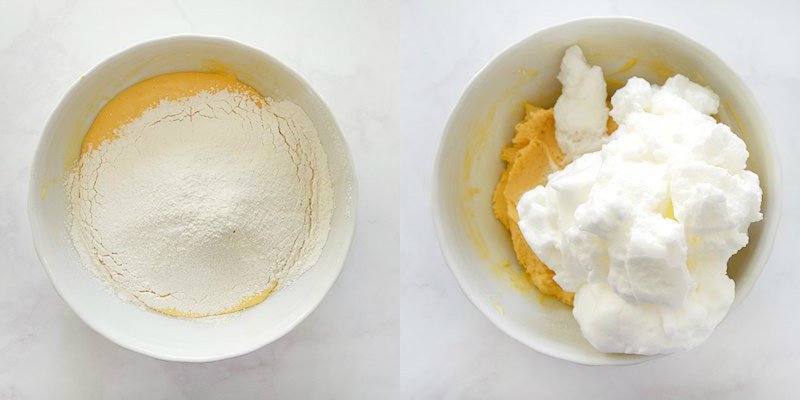 Do masy wsyp mąkę przesianą z proszkiem do pieczenia, całość dokładnie wymieszaj, by powstała jednolita masa. Schłodzone jajka ubij na sztywną pianę z dodatkiem szczypty soli.