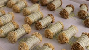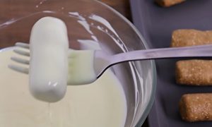 Pozwól białej czekoladzie stopić się na łaźni parowej i całkowicie przykryj nią każdą bułkę. Następnie ułożyć na blasze wyłożonej kawałkiem papieru do pieczenia. Gdy wszystkie bułki są owinięte, umieść je na tacy w zamrażarce, aby stwardniały na 10 minut.
