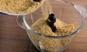 Nasiona sezamu wsypujemy na suchą patelnię i smażymy na złoty kolor. Następnie wlej je do miski robota kuchennego. Na tę samą suchą patelnię wsyp wiórki kokosowe, również niech się zarumienią i posyp sezamem, zmiksuj na drobny okruch, który wlej do głębokiej miski.
