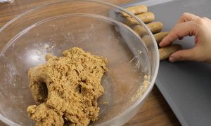 Zamiast nasion włóż połamane herbatniki do rozdrabniacza elektrycznego i zmiksuj je na proszek. Następnie wymieszaj z sezamem i wiórkami kokosowymi. Dodaj skondensowane mleko do mieszanki w takiej ilości, aby powstała spójna i nieklejąca się masa. Z przygotowanego ciasta odrywać kawałki, formować z nich krótkie bułeczki i układać obok siebie na blasze.