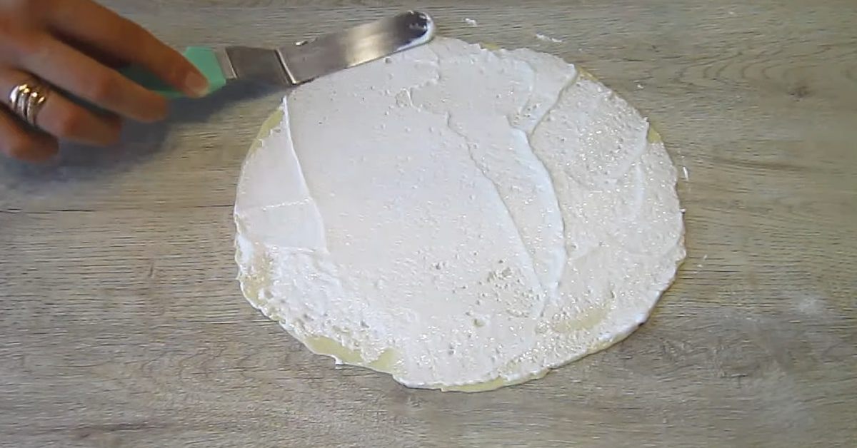 Ubij schłodzone białka z cukrem i wanilią. Ciasto podziel na 3 części, każdą rozwałkuj i posmaruj kremem proteinowym.