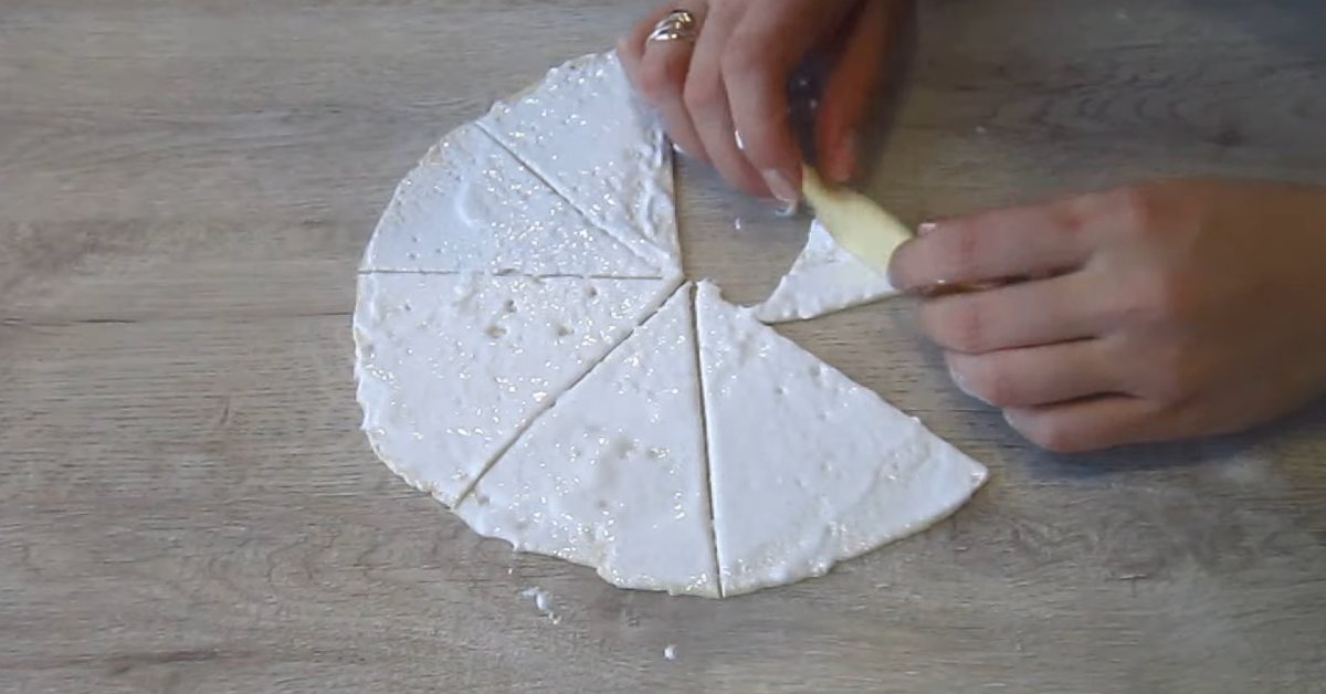 Podziel warstwy ciasta na trójkątne sekcje. Uformuj bułeczki, zwijając trójkąty od szerokiej krawędzi do ostrego rogu.