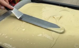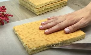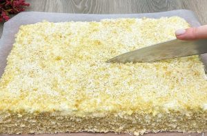 Na początek, obok siebie połóż dwa plasterki ciasta, rozprowadź na nich ćwiartkę kremu, a potem układaj kolejne warstwy ciasta i kremu w ten sam sposób. Ostatnie dwa płaty ciasta posmaruj pozostałym kremem, nie zapominając o bokach deseru. Wierzch posyp kruszonką i wiórkami kokosowymi, a na koniec umieść wypiek na godzinę w lodówce, aby się schłodził.