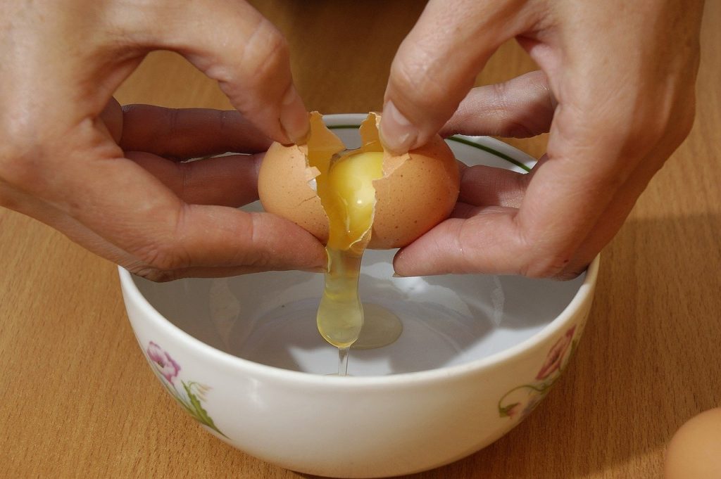 W kolejnym kroku oddziel żółtka i białka z czterech jaj. Żółtka wymieszać ze szczyptą soli.