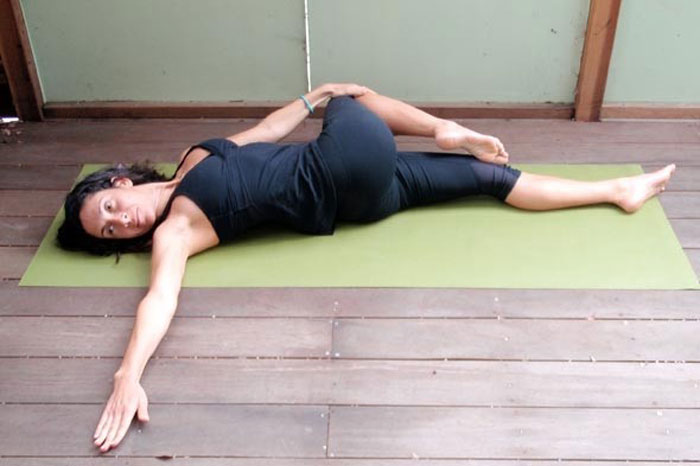 Leżąc na plecach, ręce rozłóż na boki. Unieś nogi pod kątem prostym i łagodnym ruchem połóż na prawo. Górna część ciała i ramiona spoczywają swobodnie na podłodze.