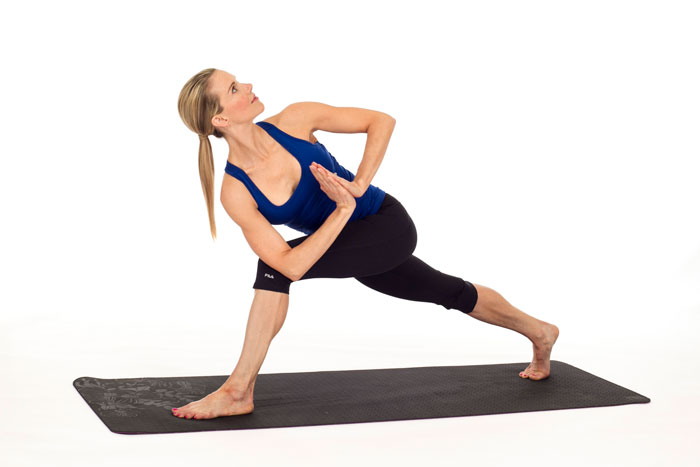Wykonaj wypad lewą nogą do przodu, prawa noga pozostaje zakotwiczona w podłożu. Patrząc do przodu. zahacz prawy łokieć za kolano lewej nogi.