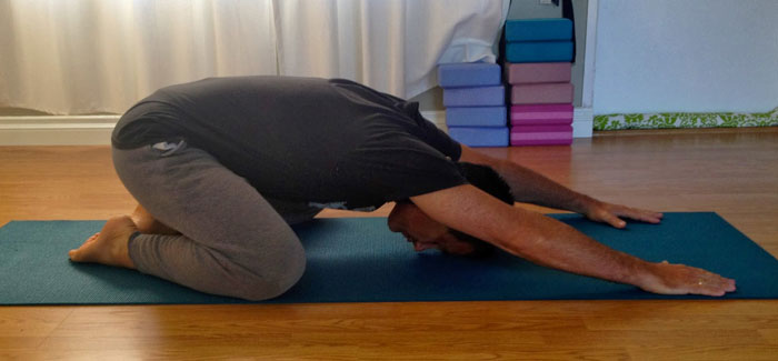 Przysiądź na stopach, wyprostuj kręgosłup i swobodnie oddychaj.