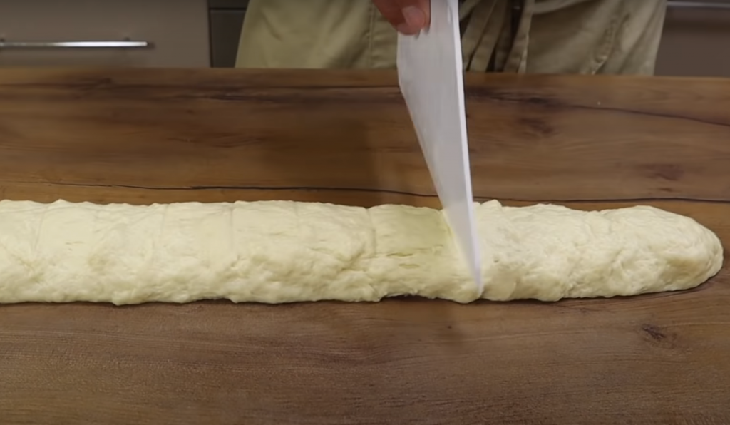 Uformuj w kulkę, zostaw w misce i nakryj ręcznikiem. Odczekaj 10 minut. Przygotuj nadzienie, pokrój zioła i dodaj je do serka kanapkowego, wymieszaj. Ciasto uformuj w wałek i podziel na kilka mniejszych części.