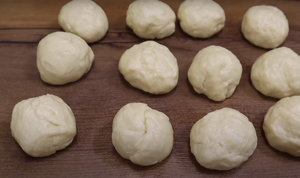 Z każdej części zrób kulkę. Każdą kulkę rozwałkuj. Na ciasto nałóż serowo-ziołowe nadzienie i zawiń w kulkę przypominającą bułkę. Nagrzej piekarnik do temperatury 180 stopni.