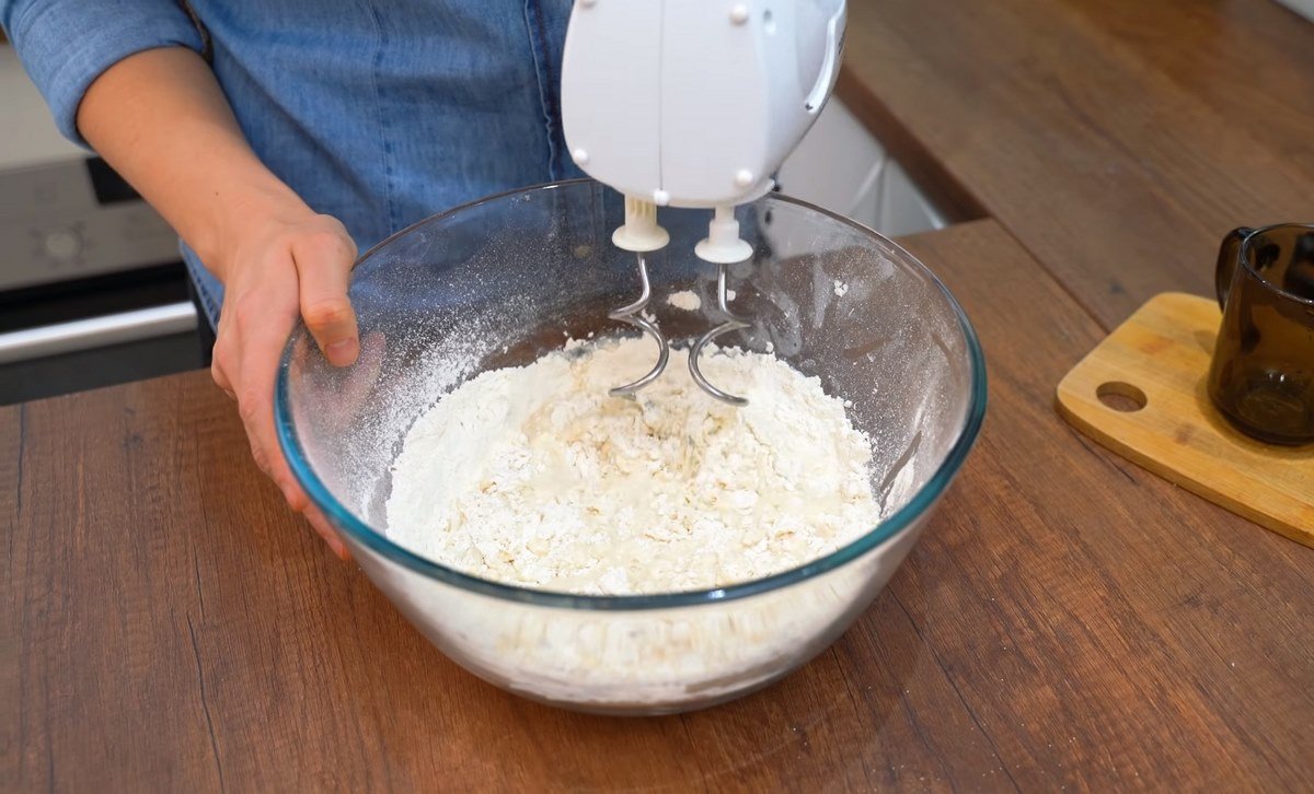 W dużej misce wymieszaj przesianą mąkę, drożdże, sól i cukier. Do suchych składników dodaj wodę i olej roślinny. Teraz musisz zagnieść ciasto. Można to zrobić ręcznie lub za pomocą miksera.