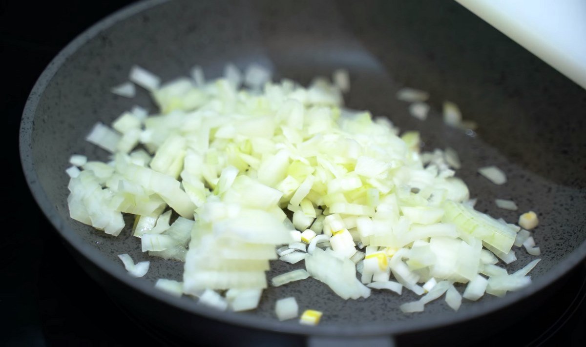 Przykryj miskę folią spożywczą i pozostaw w temperaturze pokojowej na godzinę. W międzyczasie podsmaż delikatnie drobno posiekaną cebulę. Ten etap jest potrzebny, aby cebula straciła gorycz i stała się słodka.