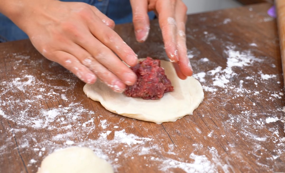 Teraz zmiel mięso i cebulę w maszynce do mięsa. Posól i popieprz mięso mielone do smaku. Podziel ciasto i nadzienie na 8 równych części. Uformuj z nich kulki. Kawałki ciasta rozwałkuj. Umieść nadzienie na środku każdego koła i połącz krawędzie nad nadzieniem, spłaszcz delikatnie dłonią.