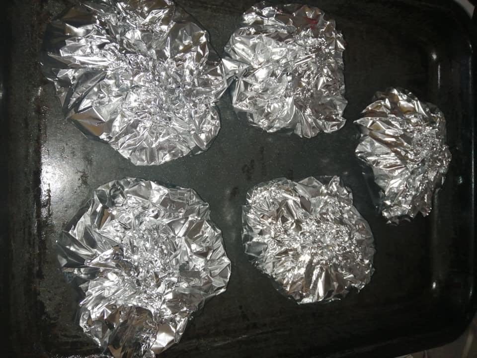 Każdy kawałek owijamy w folię aluminiową i pieczemy przez 45 minut, do momentu zmiękczenia.