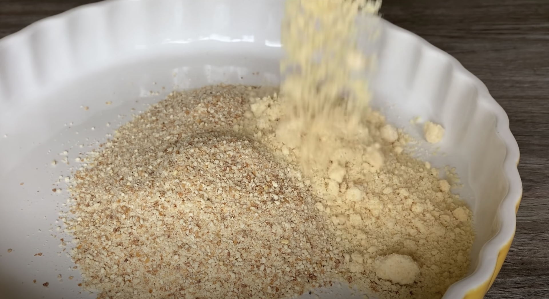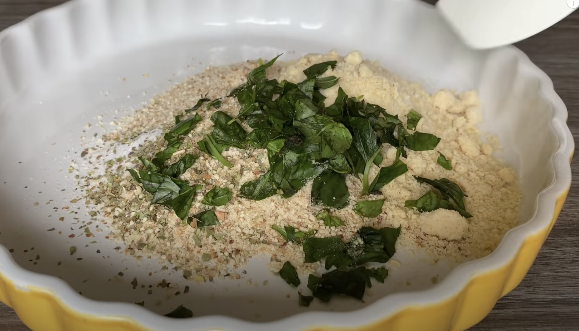 W misce należy wymieszać bułkę tartą z serem, dodać do mieszanki zioła i zmiażdżony ząbek czosnku, a na koniec ponownie wymieszać.