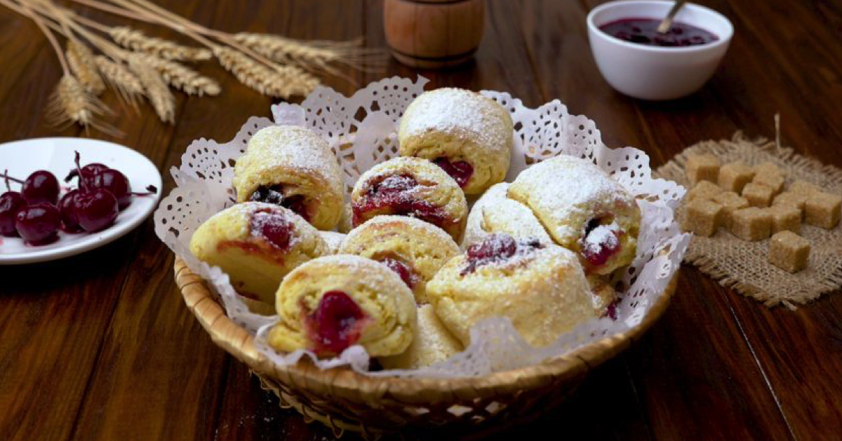 Do miski przesiej mąkę oraz proszek do pieczenia, następnie dodaj cukier i energicznie wymieszaj. Potem dodaj śmietanę, jajka, miękkie masło, po czym szybko zagnieć ciasto. Ciasto rozwałkuj na dość długi prostokąt, brzegi posmaruj dżemem i ułóż na nim wiśnie. Następnie ciasto zwiń w rulon i pokrój na porcje, po 2 wiśnie na każdą.