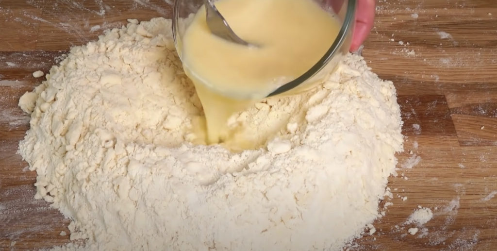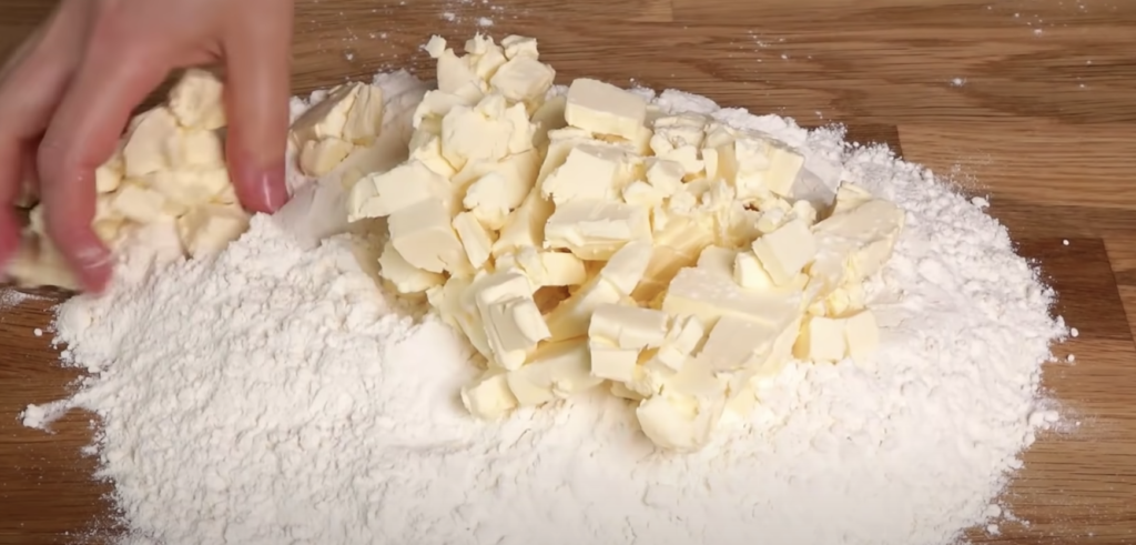 Do innego naczynia przesiej mąkę. Dodaj tłuszcz pokrojony w kostkę i zimną wodę.