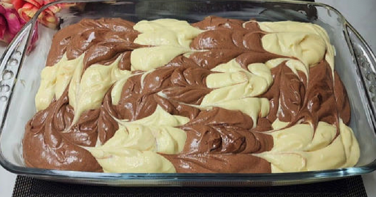 Następnie dodać proszek do pieczenia i wanilinę. Ubij mikserem. Dokładnie mieszamy. Ciasto dzielimy na dwie równe części. Do jednej części ciasta dodać kakao i wodę. Mieszamy mikserem. Formę do pieczenia smarujemy masłem. Do miski dodaj po łyżce śmietankę białą i kakaową