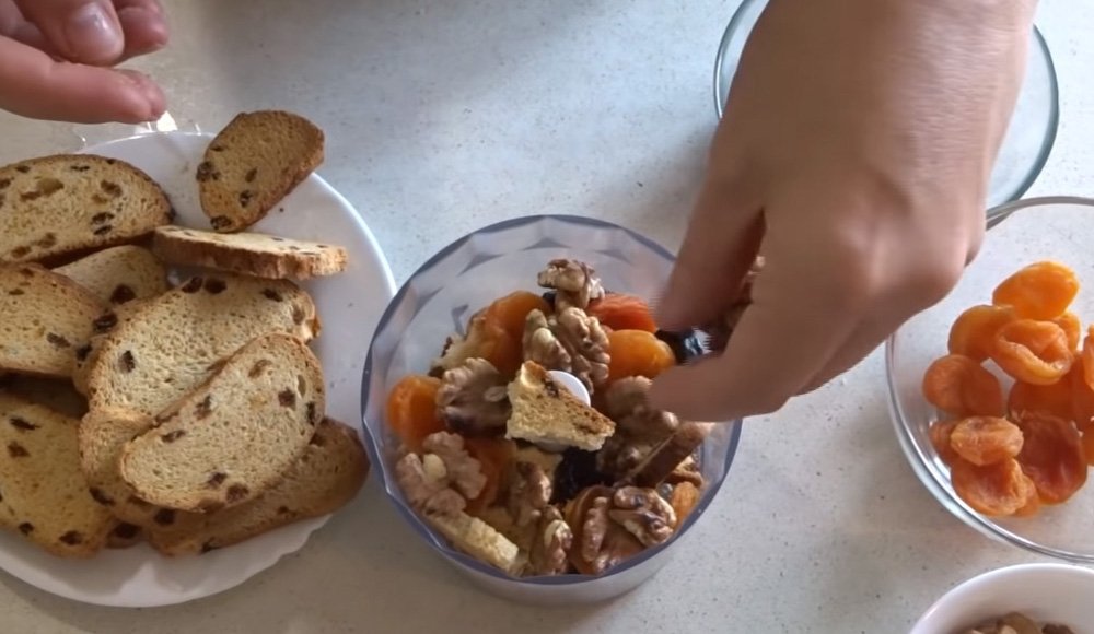 Morele, śliwki, herbatniki oraz orzechy drobno zblenduj. Umieść w miseczce 70 g czekolady i 70 g masła. Przygotuj kąpiel wodną lub rozpuść je w mikrofali.