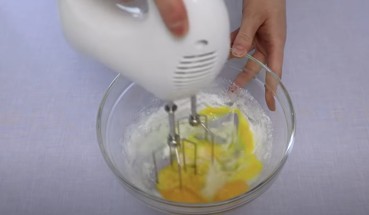 W tym czasie jajka ubij z cukrem oraz z cukrem waniliowym. Przesiej mąkę i dodaj ją do jajek razem z proszkiem do pieczenia, całość dokładnie wymieszaj.
