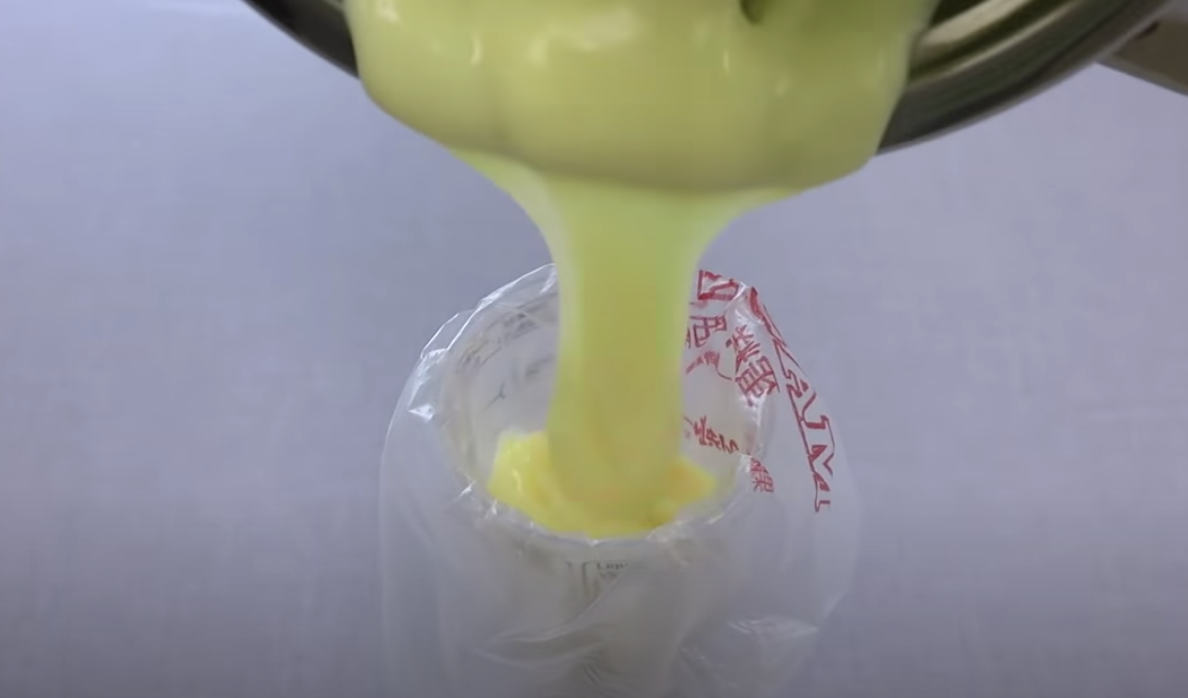 Aby przygotować krem, połącz jajko z cukrem, mlekiem oraz skrobią i ugotuj gęsty budyń. Gdy masa przestygnie, przykryj ją folią i odstaw.