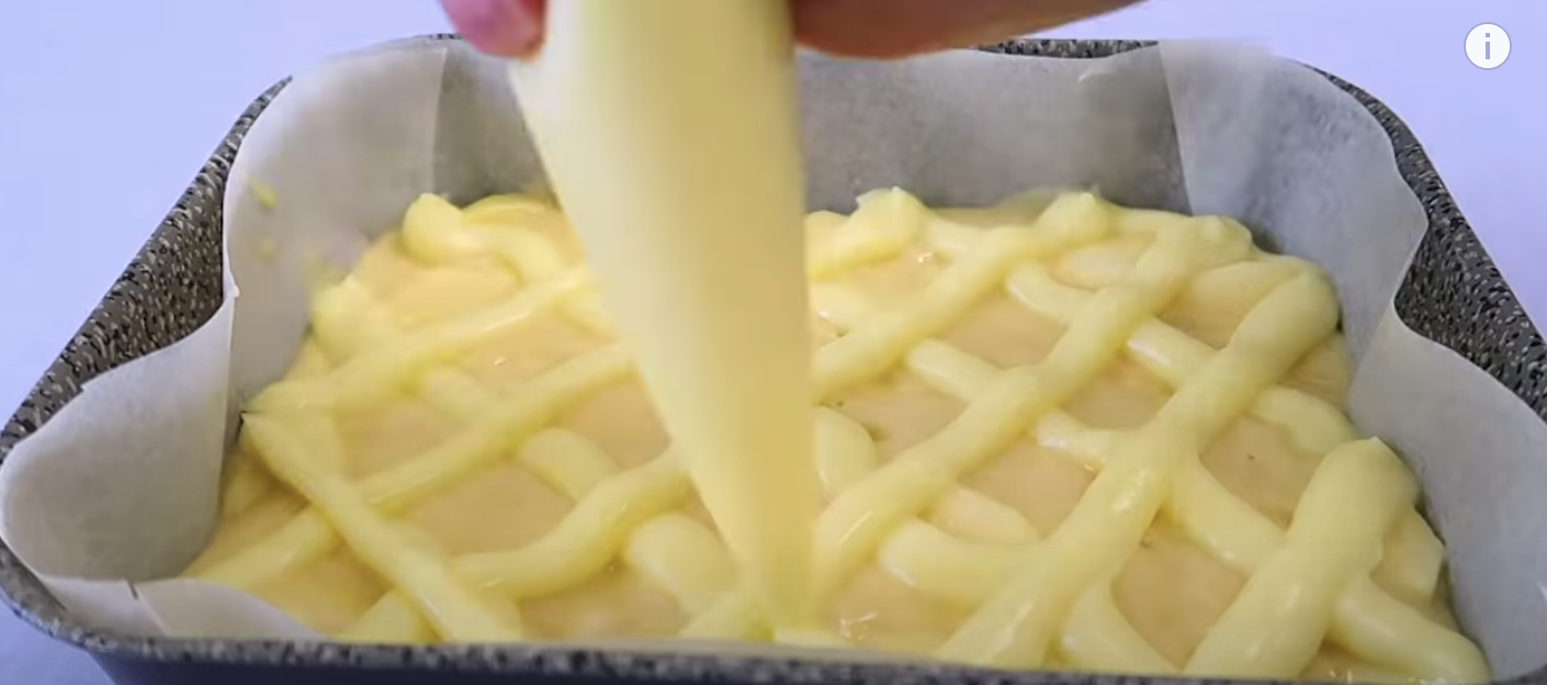 Następnie obierz jabłka, pozbądź się pestek i pokrój je w plasterki. Do formy o wymiarach 18 x 24 cm wlej ciasto i z przygotowanego wcześniej kremu utwórz na wierzchu wzory w kratkę przy pomocy szprycy cukierniczej.