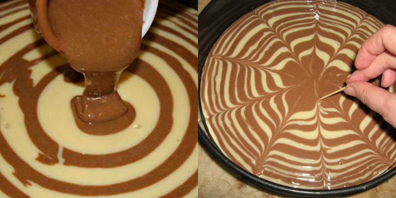 Blachę do pieczenia smarujemy olejem słonecznikowym. Wylewamy na nią ciasto na przemian – raz ciemne, raz jasne. Robimy to od zewnętrznej krawędzi blachy do środka, tworząc przy tym zebrę.