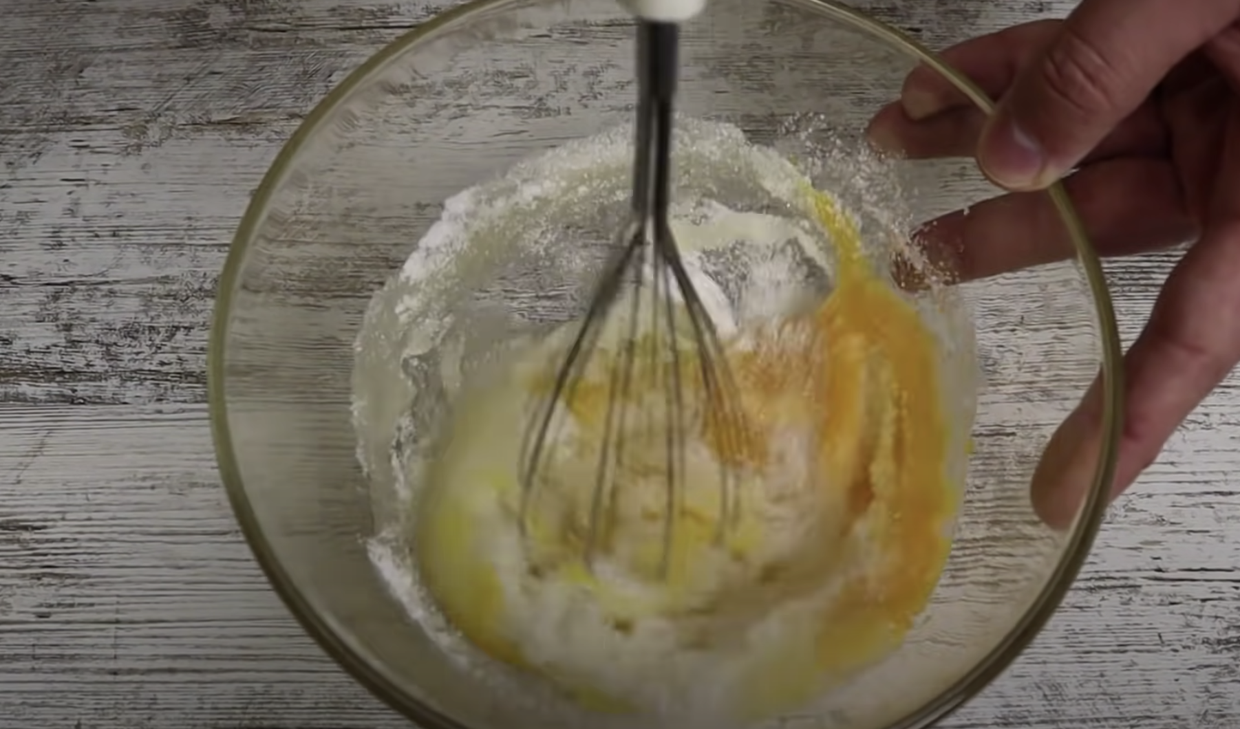 Do tego dodajemy mąkę wraz z proszkiem do pieczenia i całość mieszamy do uzyskania jednolitego ciasta.