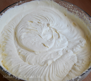 Do naczynia wlej mleko, śmietankę, cukier i pudding. Dodaj cukier waniliowy. Wszystko miksuj przez 5 minut, do uzyskania jednolitego, sztywnego kremu.