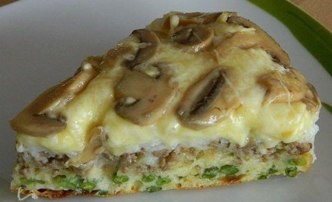 Obfite ciasto z pieczarkami z różnymi rodzajami sera, mięsem mielonym i zieloną fasolką. Możesz użyć różnych składników w zależności od gustu.
