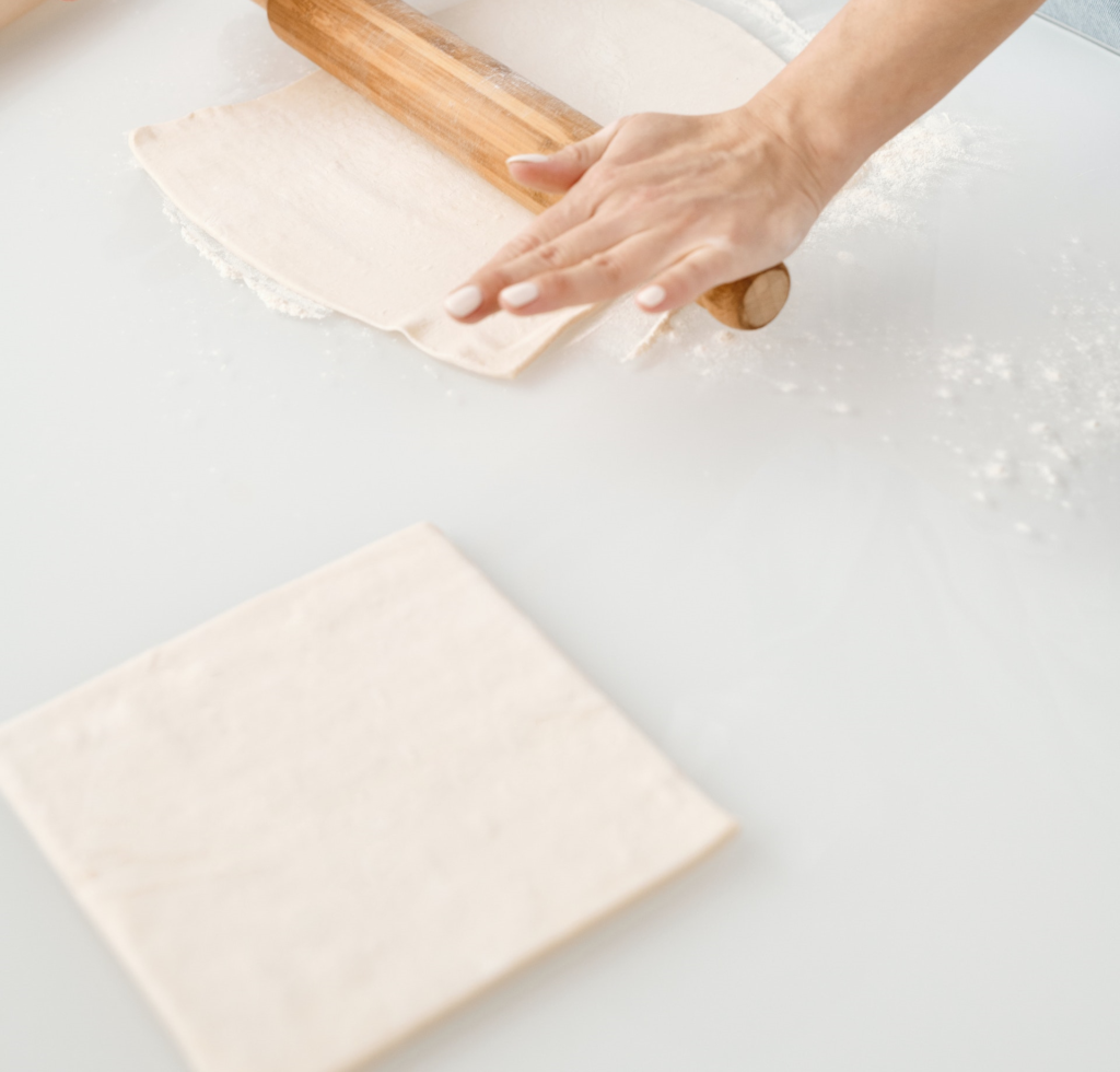 Najlepiej pracować z arkuszem schłodzonego ciasta francuskiego. Jeśli go nie masz, musisz rozwałkować ciasto na prostokąt.