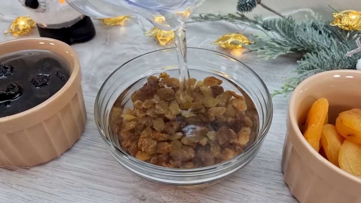 Suszone owoce zalać wodą. Orzeszki podsmażyć na suchej patelni, a następnie obrać.