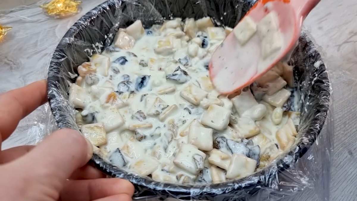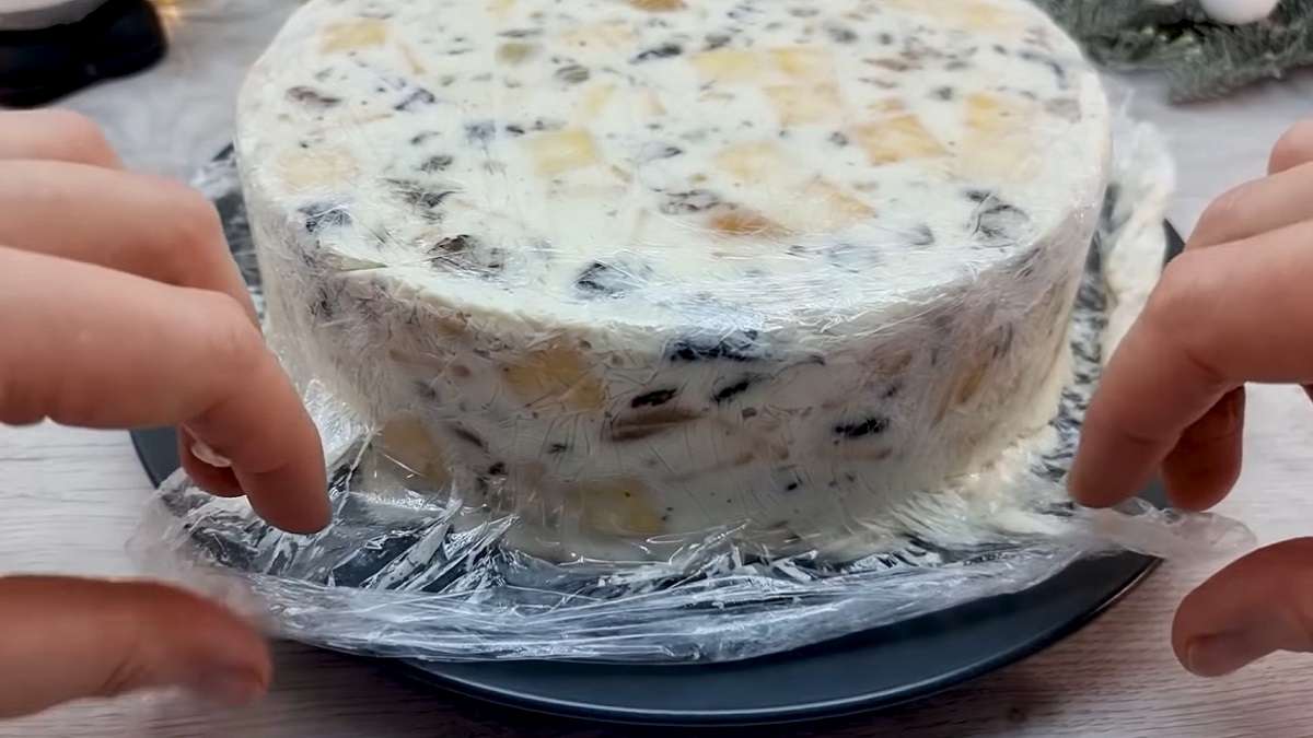 Przykryj formę folią spożywczą i umieść tam przygotowaną masę. Przykryj go deską, dołączając ciężar.
