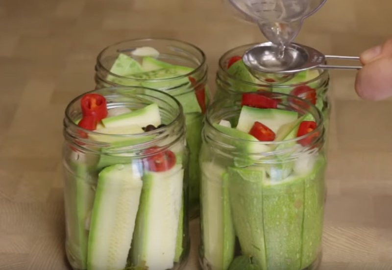 Do tak przygotowanych słoików wkładaj cukinię, aż wykorzystasz każde wolne miejsce. Tak przygotowane warzywa zalej wrzątkiem i odstaw na 10 minut.
