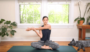 Ten ruch można powtórzyć kilka razy. Podczas ostatniego powtórzenia kontynuuj wyciąganie ramion do przodu. Zwiększy to komfort i łatwość wykonania tej postawy. Przez cały czas pogłębiaj swój oddech.