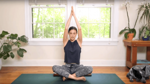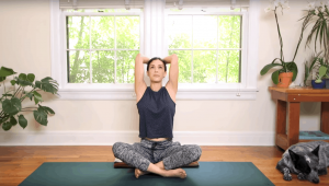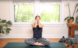 Na sekundę unieś wysoko ramiona i przyciśnij dłonie do siebie. Następnie zegnij ramiona tak, aby łokcie były skierowane do góry. Kontynuuj głębokie oddychanie w tej pozycji.
