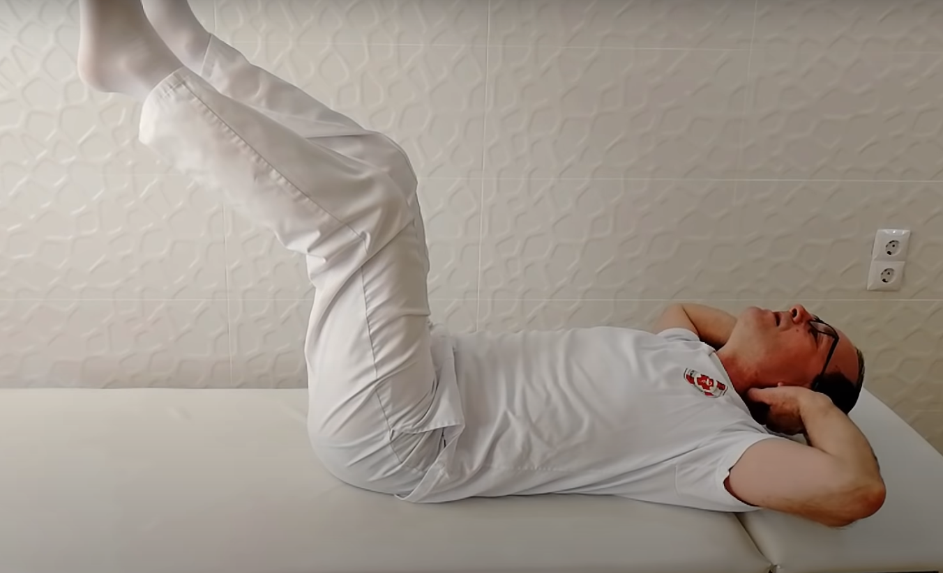 Najbardziej skuteczne w przypadku bólu krzyża. Jeśli to możliwe, zegnij nogi w kolanach i ułóż je na stołku bądź innym podwyższeniu. Ręce załóż za głowę. W czasie wydechu unieś podbródek o 5-10 centymetrów, ale bez zginania szyi.