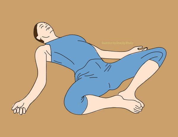 Podczas wykonywania szóstego ćwiczenia też trzeba leżeć na plecach, ale ugiąć kolana łącząc kostki. Rękami należy przyciągnąć nogi do ciała i przytrzymać kolana.