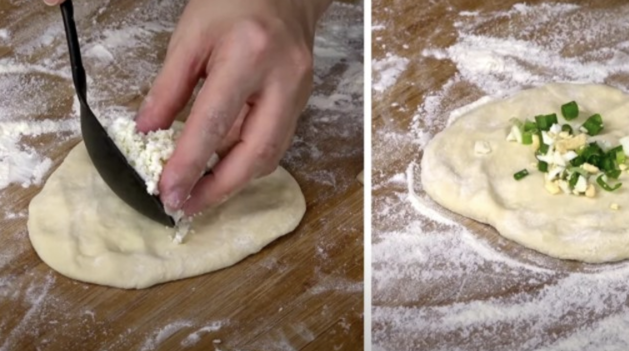 Jeśli robisz placuszki z nadzieniem, ciasto cienko rozwałkuj, ułóż nadzienie, zawiń w kulkę i ponownie delikatnie rozwałkuj.