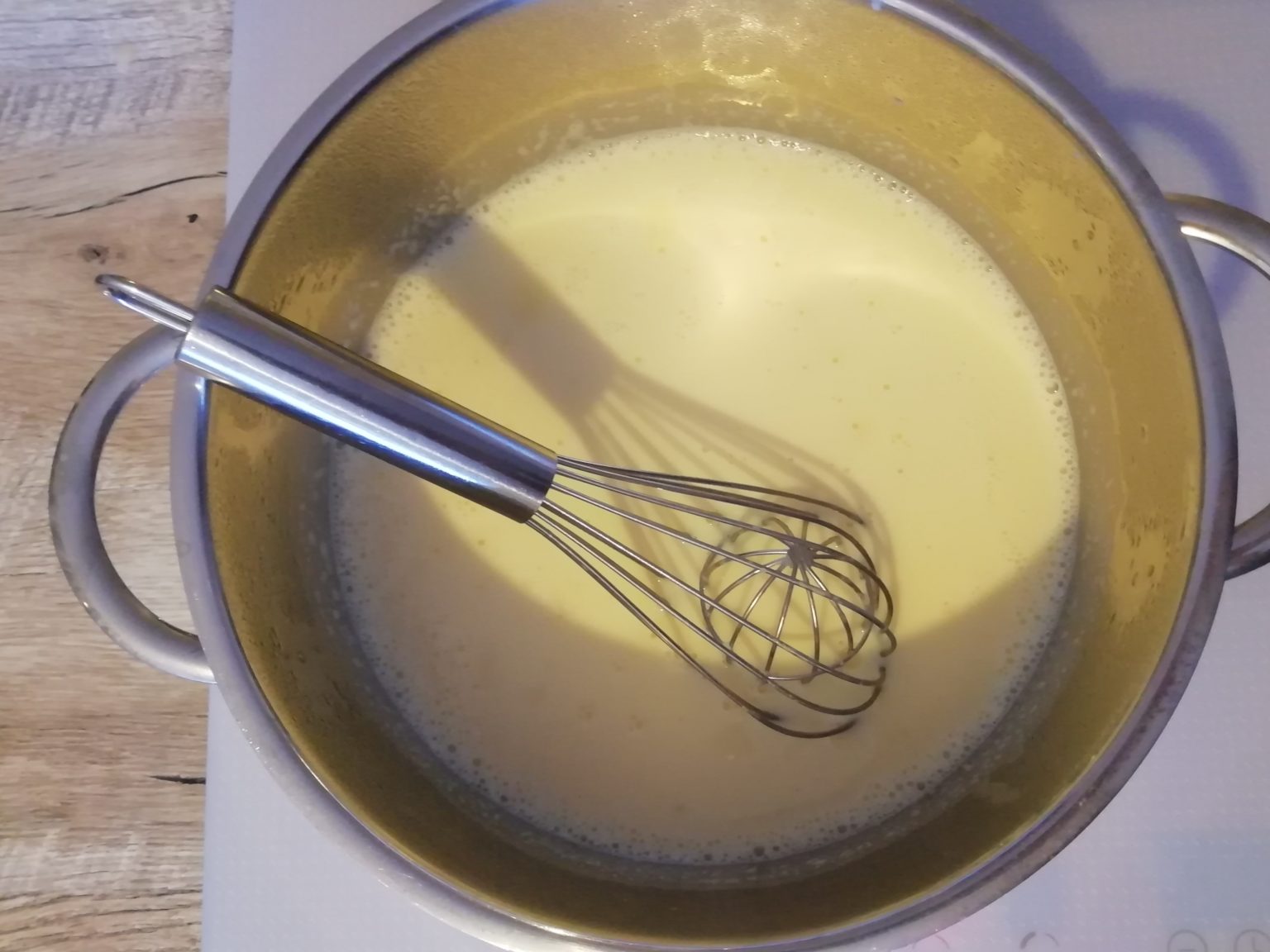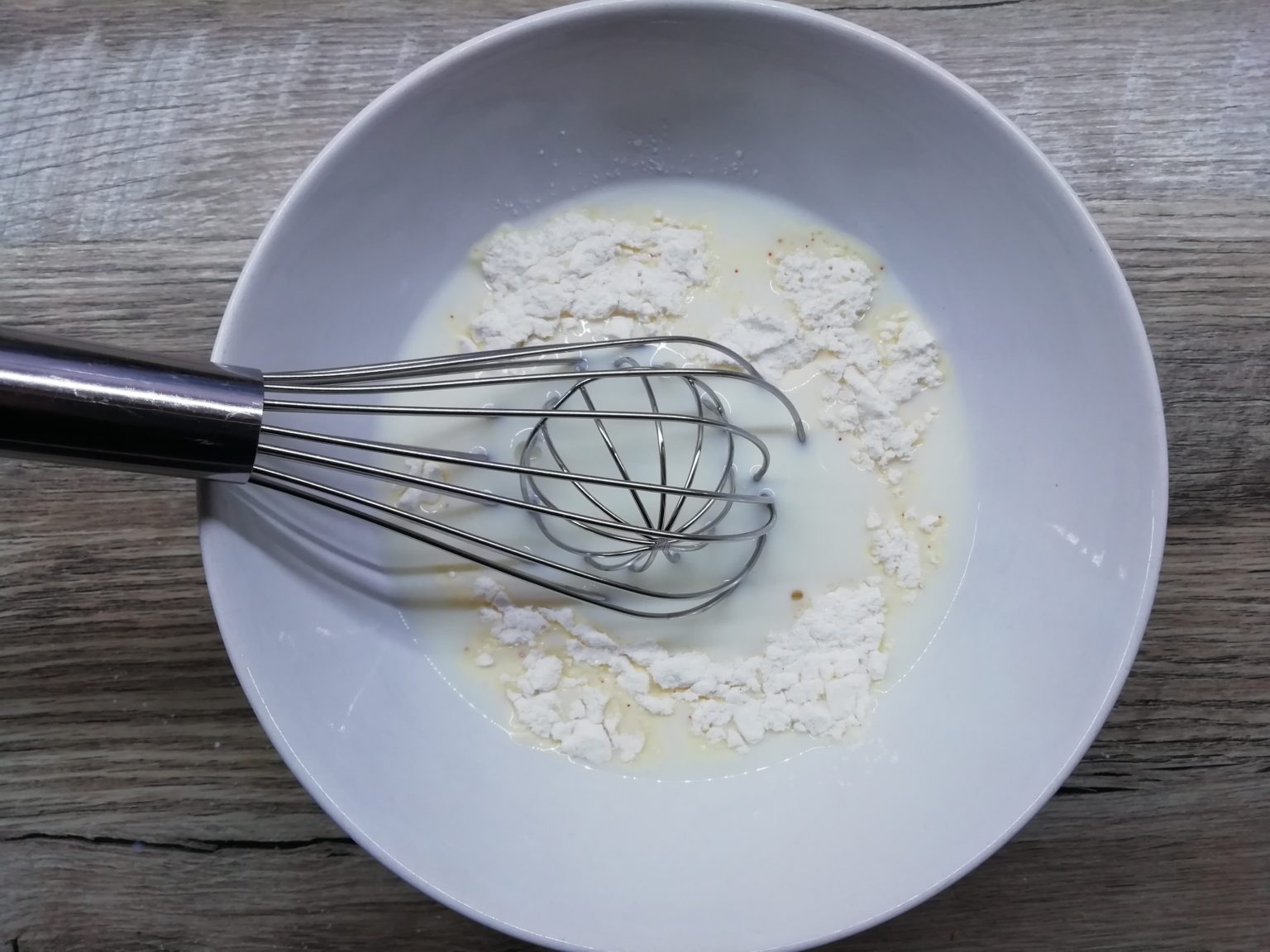 Nie zapominamy o mieszaniu. Wymieszaj pozostałe mleko ze skrobią kukurydzianą. Gdy mieszanka będzie dobrze wymieszana, dodaj ją do mleka.